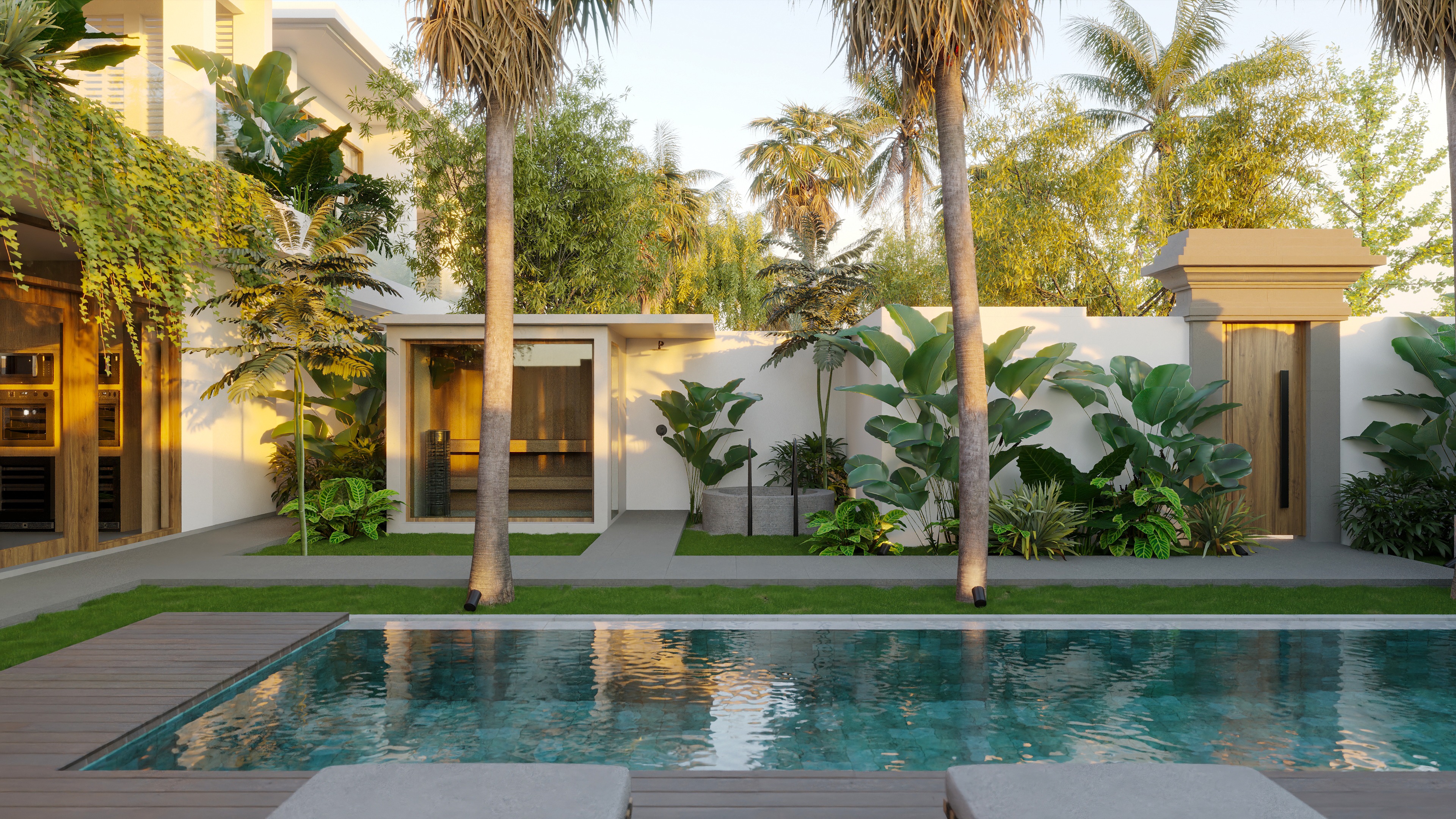 To complete the experience, Villa Hanoman features a dedicated wellness zone equipped with a sauna and cold plunge, offering a private spa experience integrated directly into the design.